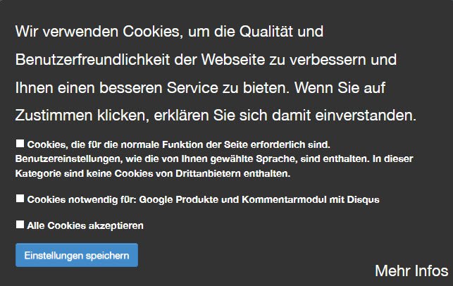 Ab sofort stehen Ihnen im Worldsoft-CMS neue Auswahlmöglichkeiten für Ihre Cookie-Banner zur Verfügung. Statt der bisher standardisierten Bannerart gibt es nun drei verschiedene Auswahlmöglichkeiten:
