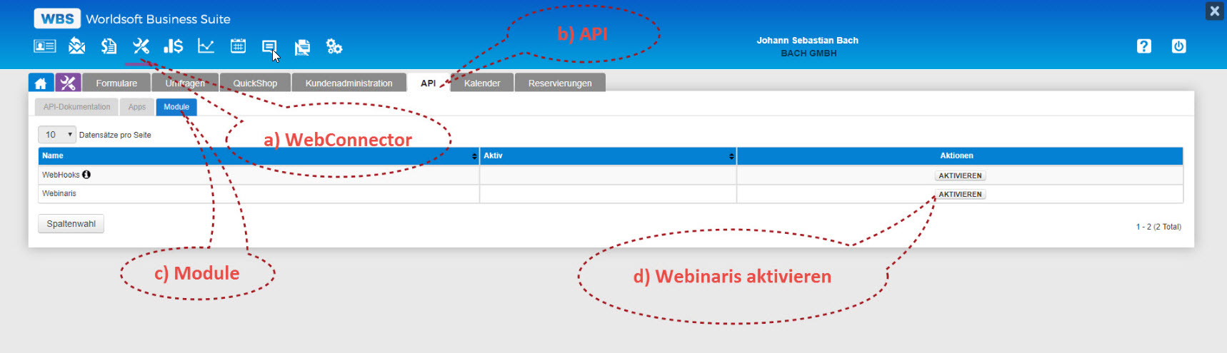 Die WBS (Worldsoft Business Suite) bietet neu die Möglichkeit eine Schnittstelle zu Webinaris kostenlos zu aktivieren und zu nutzen. Sie finden den Button im WebConnector mit der Bezeichnung "API":