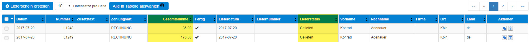 e) Später erstellen wir einen zweiten Lieferschein aus dieser Rechnung für die restlichen beiden Artikel. Jetzt sind alle Artikel vollständig geliefert und in der Tabelle der Lieferscheine werden beide Lieferungen angezeigt: