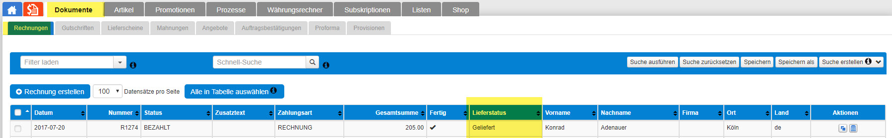 f) Neu: Da jetzt alle Artikel geliefert sind wird in der Tabelle der Rechnungsdokumente der Lieferstatus automatisch von "Teillieferung" auf "Geliefert" umgestellt: