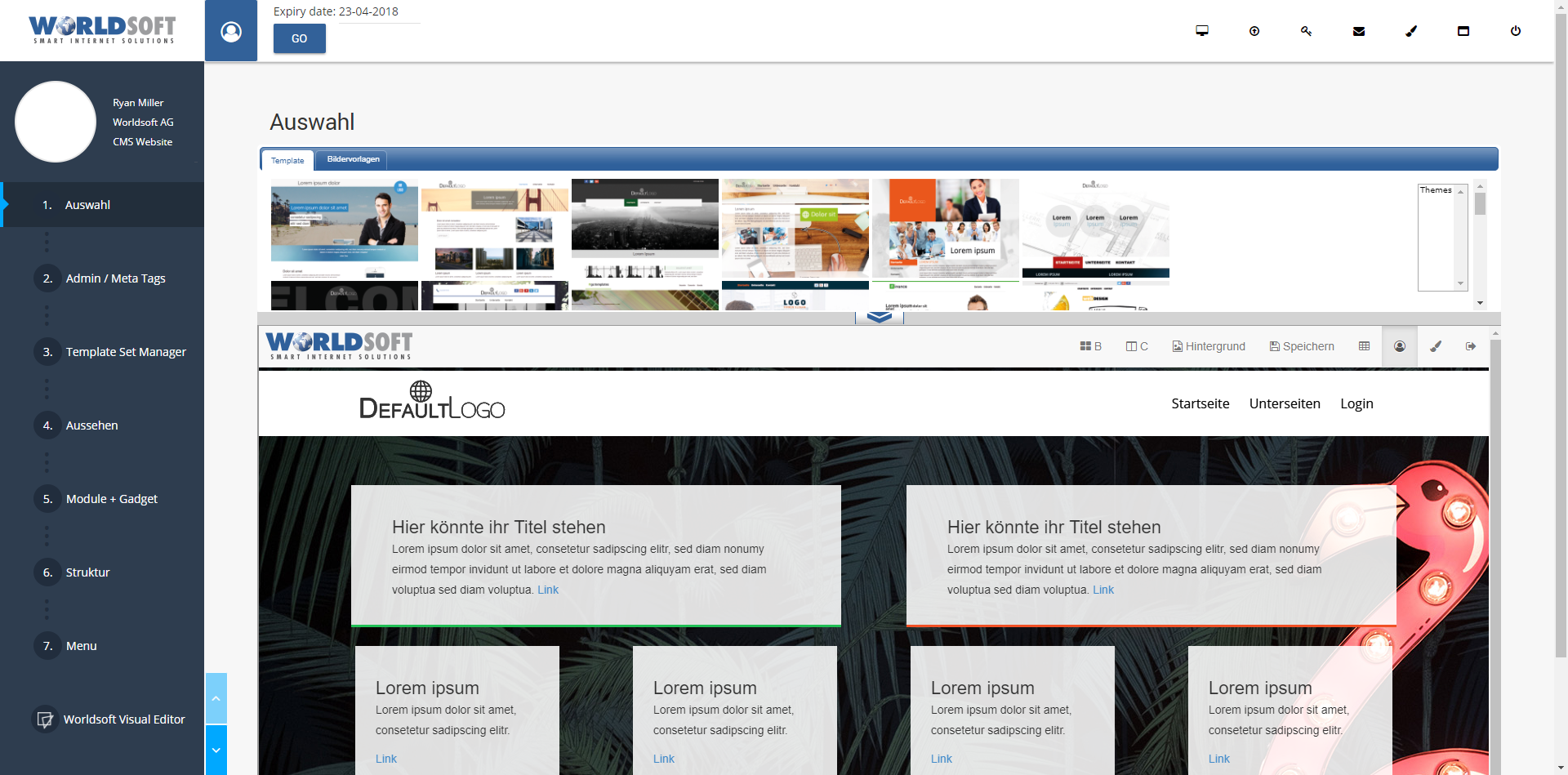 Für das Worldsoft-CMS 2017 mit Atomic Design Wizard und Visual Editor stehen Ihnen jetzt 33 neue und angepasste Themes zur Verfügung. Sie finden die neuen Themes im Punkt 1 der Auswahl unter "Themes auswählen". Es gibt dort nur noch eine Kategorie mit dem Namen "Themes":