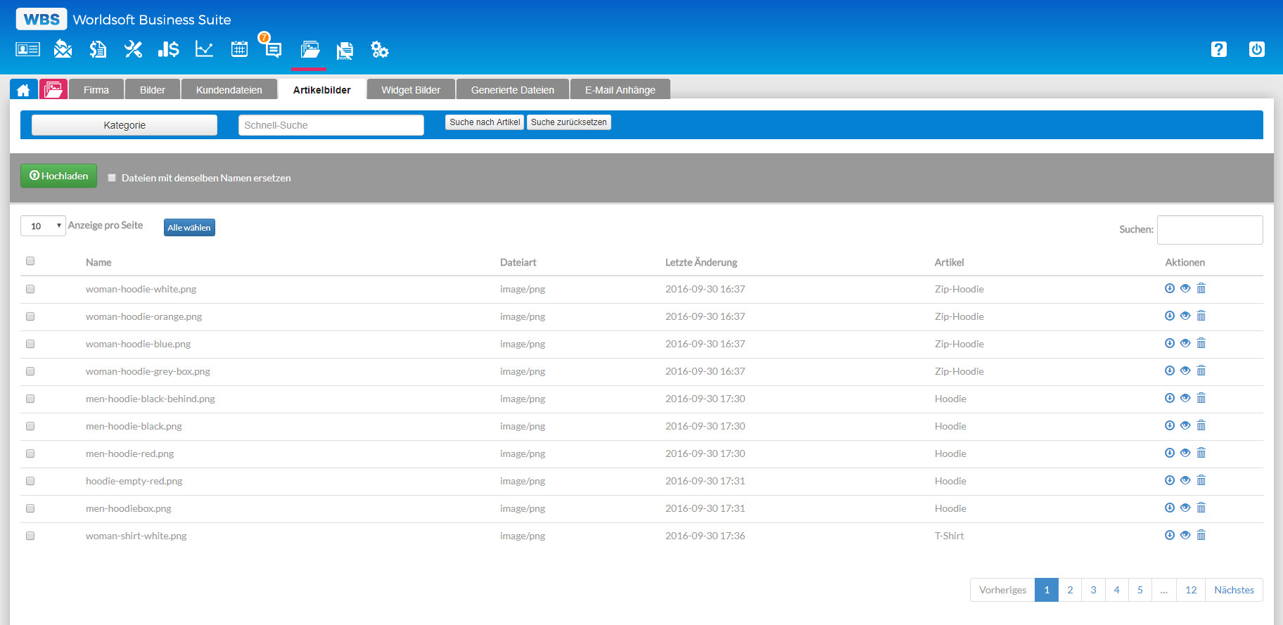 Kunden der Worldsoft Business Suite profitieren jetzt von einem Datei-Manager. Dort sind alle Bilder, Artikelbilder, generierte Dateien, E-Mail-Anhänge und Kundendateien an einer zentralen Stelle und können gesucht, verwaltet und hochgeladen werden. Hier finden Sie Anleitungen dazu: Dateinmanager-Anleitungen